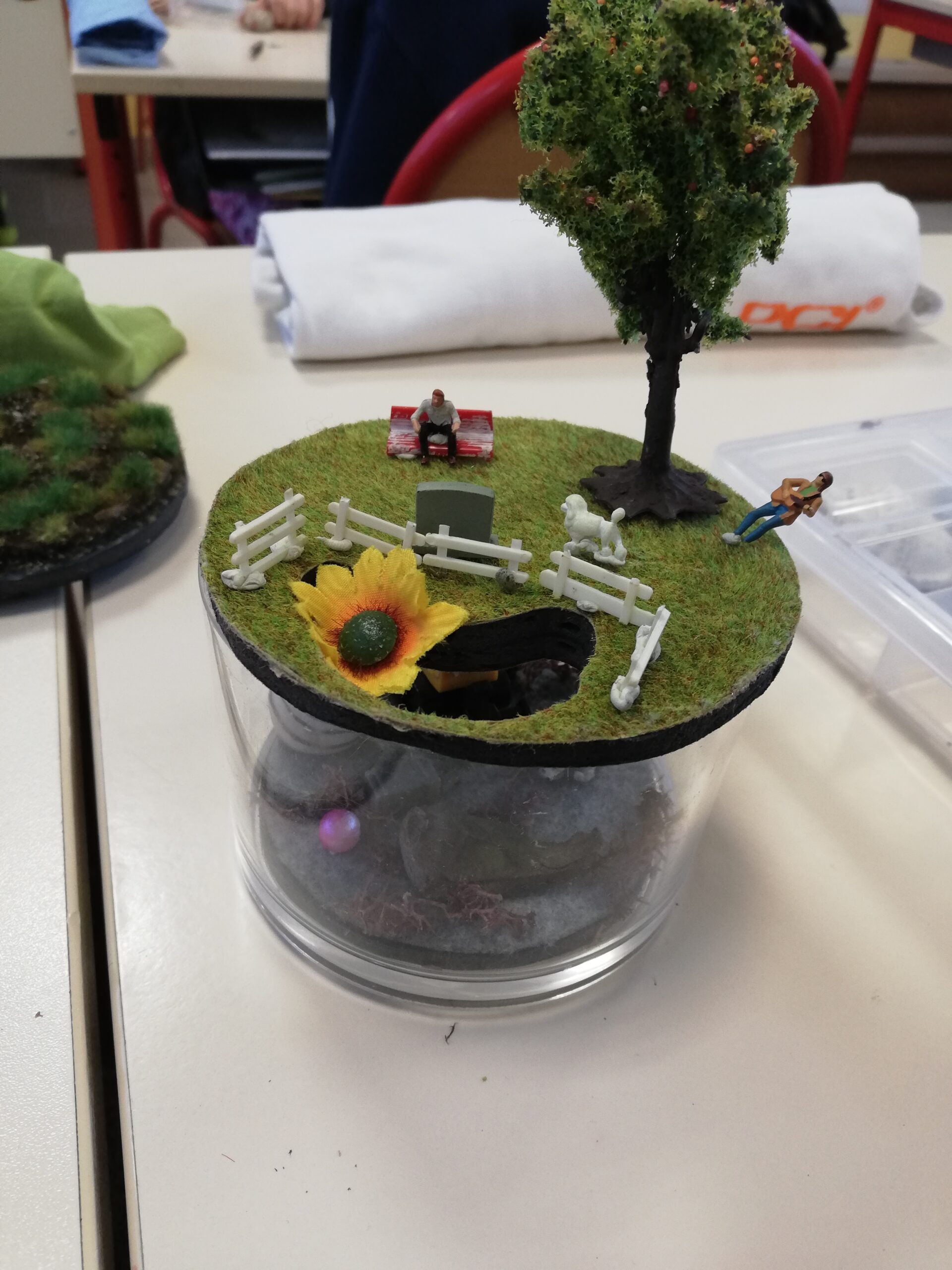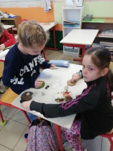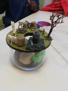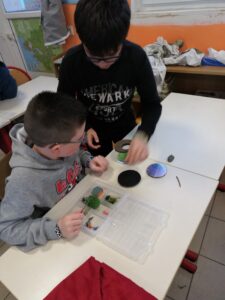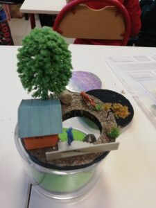 Les enfants ont ensuite eu un temps de création par deux. Ils devaient imaginer un monde à la surface et sous terre. Un titre a été trouvé pour chaque production. Ils ont ensuite écrit une petite histoire correspondant à leur production.